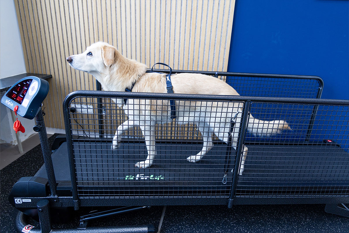 Unser Trockenlaufband bildet eine tolle Ergänzung zu unseren Unterwasserlaufbändern und bietet uns weitere Therapie- und Trainingsmöglichkeiten. Es ist eines der wenigen Laufbänder, welches man in Steigung und Neigung benutzen kann. So können unsere Hunde bei Bedarf bergab und bergauf gehen und dabei vermehrt die Muskulatur der Vorder- oder der Hinterbeine trainieren. Auch unsere gelähmten Hunde, die auf dem Weg der Besserung sind, können mithilfe von einem speziellen Geschirr und dem Mitführen der Beine durch die Therapeutin, schneller zurück zu einem normalen Gangbild finden.